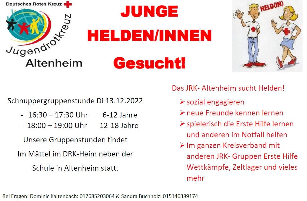 Schnupperstundenstunde: Di 13.12.2022, 16:30-17:30 Uhr im Mättel, im DRK-Heim neben der Schule in Altenheim.